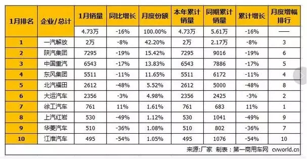 上表可見(jiàn),1月份牽引車(chē)市場(chǎng)同比下滑16%,具體到1月銷(xiāo)量前十企業(yè)來(lái)看1增9降,和市場(chǎng)的趨勢(shì)高度吻合,僅徐工汽車(chē)一家企業(yè)實(shí)現(xiàn)增長(zhǎng)。