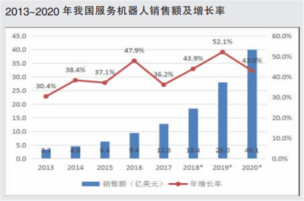 除此之外,我國服務機器人的市場規模快速擴大,成為機器人市場應用中頗具亮點的領域。2018年,我國服務機器人市場規模有望達到18.4億美元,同比增長約43.9%,高于全球服務機器人市場增速。到2020年,隨著停車機器人、超市機器人等新興應用場景機器人的快速發展,我國服務機器人市場規模有望突破40億美元。