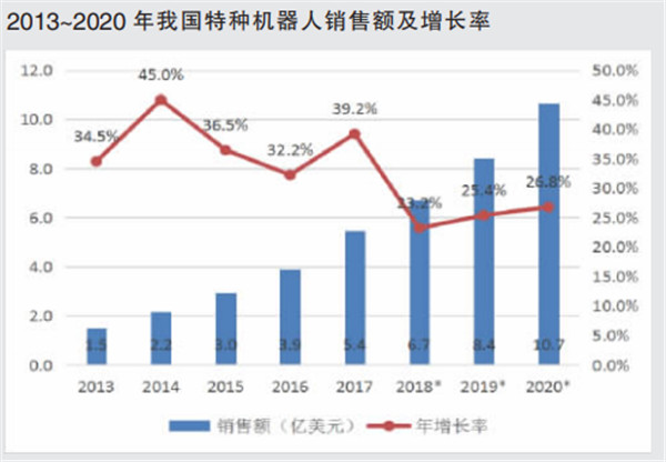 當前,我國特種機器人市場保持較快發展,各種類型產品不斷出現,在應對地震、洪澇災害和極端天氣,以及礦難、火災、安防等公共安全事件中,對特種機器人有著突出的需求。2018年,我國特種機器人市場規模預計將達6.7億美元,增速達到23.3%,高于全球水平。其中,軍事應用機器人、極限作業機器人和應急救援機器人市場規模,預計分別為4.7億美元、1.5億美元和0.5億美元,極限作業機器人是增速最快的領域。隨著我國企業對安全生產意識的進一步提升,將逐步使用特種機器人替代人在危險場所和危害環境中進行作業。到2020年,特種機器人的國內市場需求規模有望達到10.7億美元。