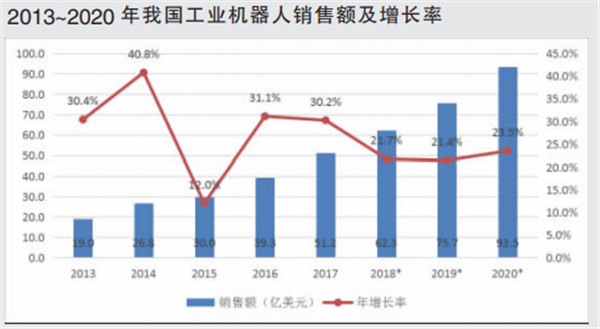 據《中國機器人產業發展報告(2018)》顯示,我國工業機器人市場發展較快,約占全球市場份額三分之一,是全球第一大工業機器人應用市場。據統計,2017年我國工業機器人銷量達13.8萬臺,同比增長30%,預計2018年銷量將超過15萬臺,市場規模將達到62.3億美元。到2020年,國內市場規模將進一步擴大到93.5億美元。